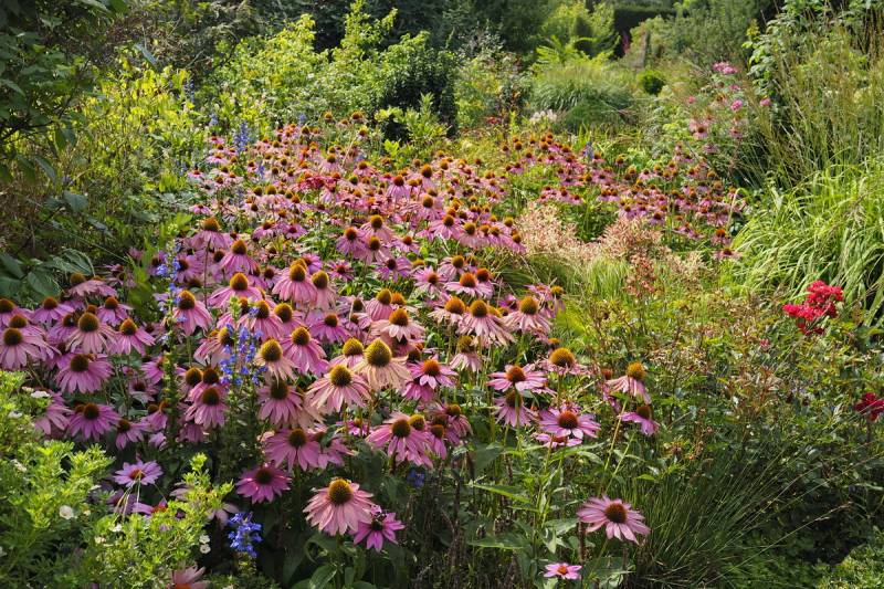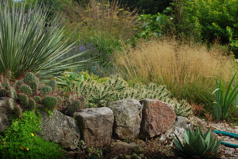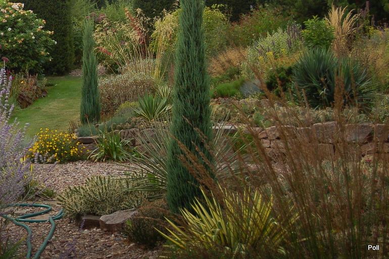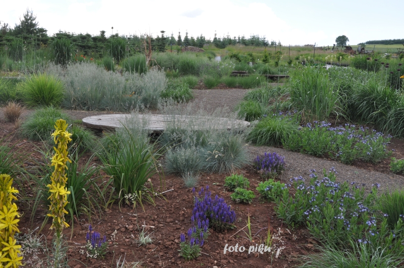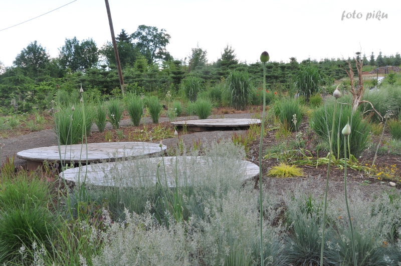 Tymczasem, znaleźliśmy się w pokoju preriowym...Na lewo od ściezki podniesiono nieco skarpę tworząc prostokątny placyk, wokół którego zbudowany jest kilkuwarstwowy murek z prostokątnych kamieni. To właśnie miejsce skupia wiele gatunków i odmian roślin, które kojarza się nam z typową prerią. Własciciele podkreslili ten charakter ściółkując glebę nieregularnym żwirem