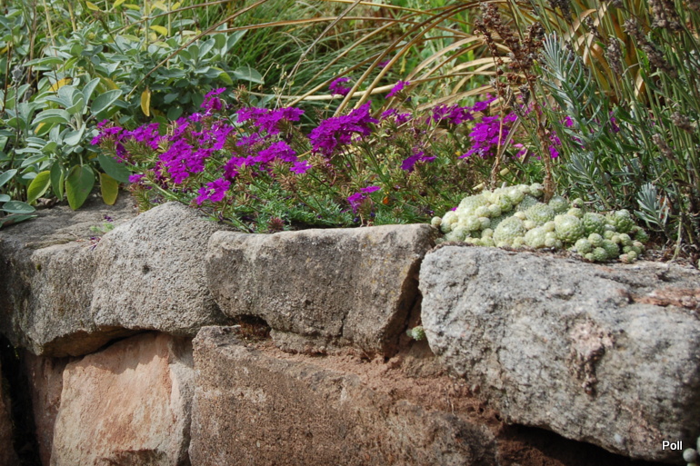 W centrum, pod murem ustawiona jest ławka, na której możemy usiąść, by w spokoju oglądać zgromadzone tu rośliny i podziwiać sposób ich nasadzeń, bowiem oprócz roślin wyeksponowanych na podniesionej skarpie, wypatrzeć mozna sporo dość pospolitych gatunków, których siła polega nie na urodzie a sposobie rozrastania się. Wetknięte w szczeliny muru spływają w dół, lub tworzą coraz to większe kolonie , wchodząc niemal jedne na drugie.