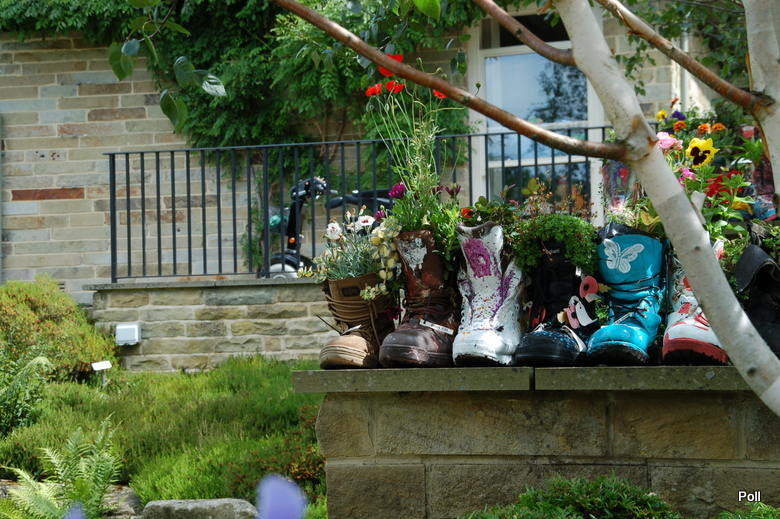 Ten problem jest coraz częściej podnoszony w prasie, czy telewizji. Bije się na alarm, ze Anglia staje się szarym, wybetonowanym krajem. Stąd sporo inicjatyw, m.in. RHS (Królewskie Towarzystwo Ogrodnicze), które mają ponownie obudzić ogrodniczego ducha w narodzie angielskim. Podczas mojej ostatniej wizyty w ogrodzie Harlow Carr ( zapewne i Olusi też ) , trwała akcja RHS pod tytułem 'Zazieleńmy szarą Brytanię'. Prowadzono pogadanki, wydano ulotki i plakaty, ale nie tylko... By zwrócić uwagę na problem w jakiś nietuzinkowy sposób, z pomocą 6 Regimentu Królewskiego Korpusu Logistycznego , który współpracuje z RHS CO w Yorkshire, zorganizowano dla uczniów tutejszych szkół 'Boot camp'.