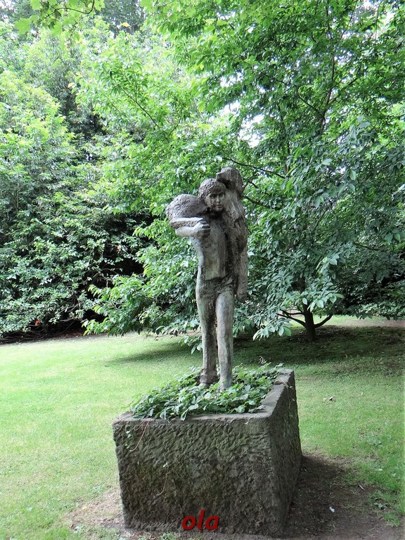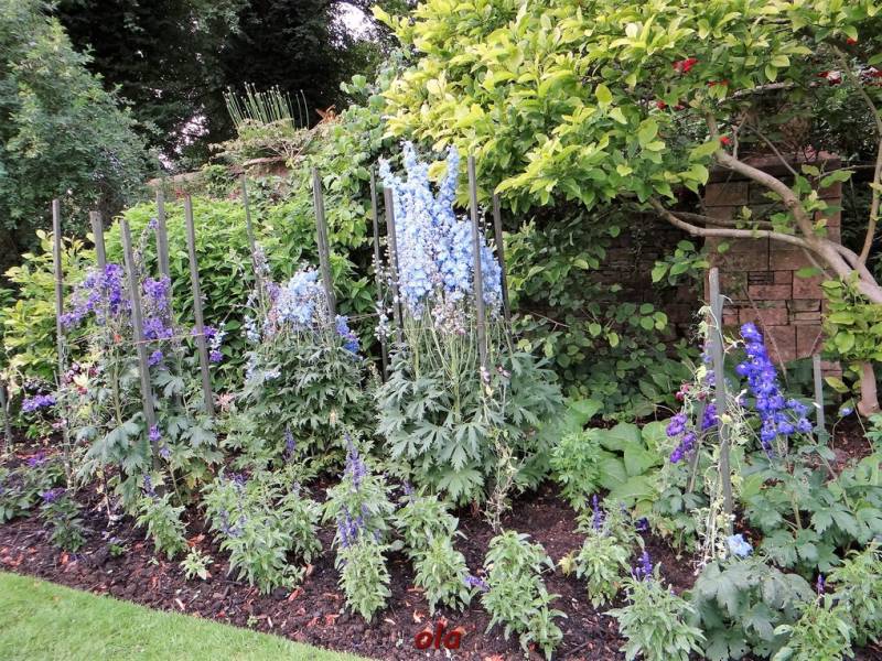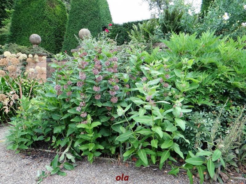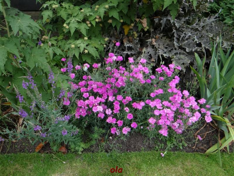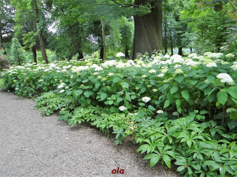 Na tle żywopłotowej zieleni mamy naturalistyczne nasadzenia dużych bylin ( ostróżki , naparstnice ....) i krzewinek i krzewów ( róże , jaśminowce ).