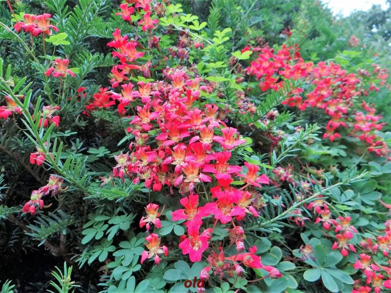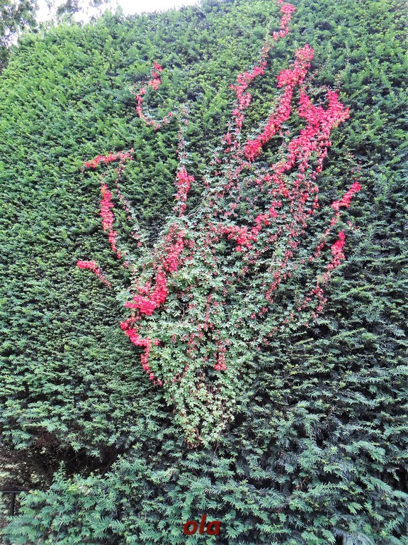Na cisowym żywopłocie pnie się nasturcja pnąca . Ta delikatna bylina zdobi ciemną zieleń cisa . Sięga 3 metrów wysokości a kwitnie od VI do IX .