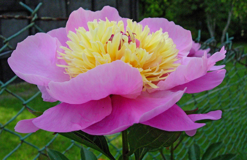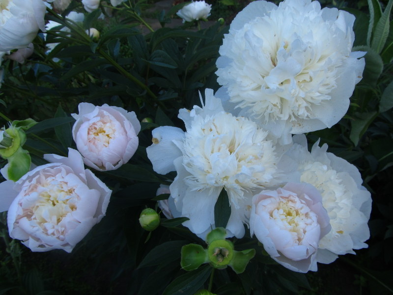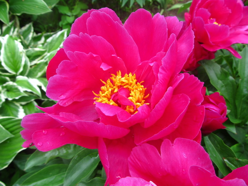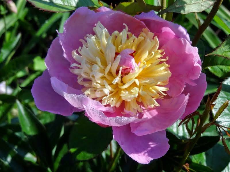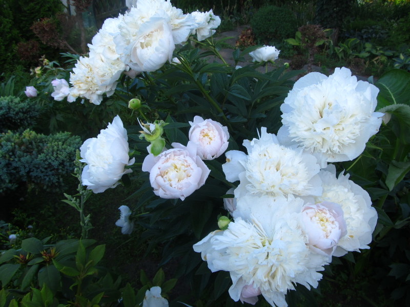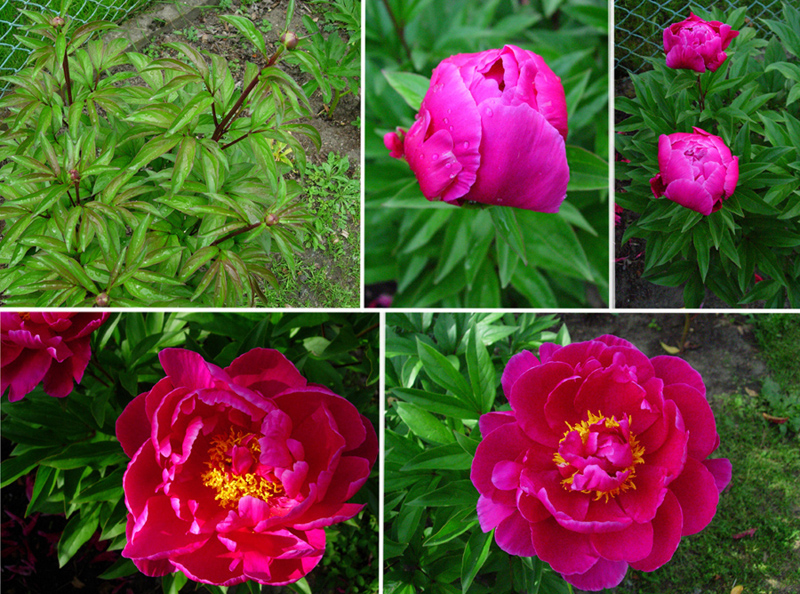 I jeszcze jedna peonia. Wydaje mi się, że taką samą ma Andrzej (post 1; fot. 6 i 7). Jest to też peonia wiśniowa, ale wręcz z odcieniem śliwkowym i charakterystycznym srebrzystym połyskiem. Pachnie, nie za mocno. Pędy bardzo silne - nie potrzebuje podpór. Trudno mówić o terminie kwitnienia, bo w tym roku to co kwitło przez miesiąc, przez upały trwało tylko 2 tygodnie. U mnie zakwitła pierwszy raz - od razu 5. kwiatami. Bardzo charakterystyczna jest gruba, gęsta "korona" złotych pręcików w środku i składa płatki w bardzo charakterystyczny, uporządkowany sposób. Swego czasu podejrzane były Karl Rosenfield lub Etienne Mechin. Proszę o sugestie pukpuk .