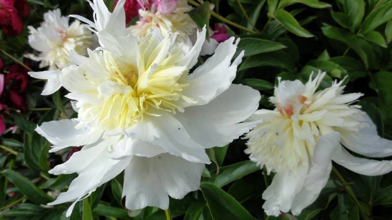 Hodowca Carl G. Klehm 1970 USA Kwiaty: typu anemonowego (japońskiego) ok. 20 cm, podwójne, Duże, kremowobiałe płatki zewnętrzne otaczają duży środek żółtozłotych pręcików, z których wyrastają kolejne kremowobiałe płatki Zapach: delikatny "słodki" Wysokość: do 90 cm Liście: jasnozielone, błyszczące, "jedwabiste" Pędy: dość sztywne, występują pąki boczne Termin kwitnienia: połowa czerwca