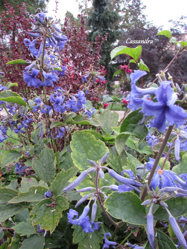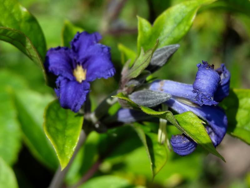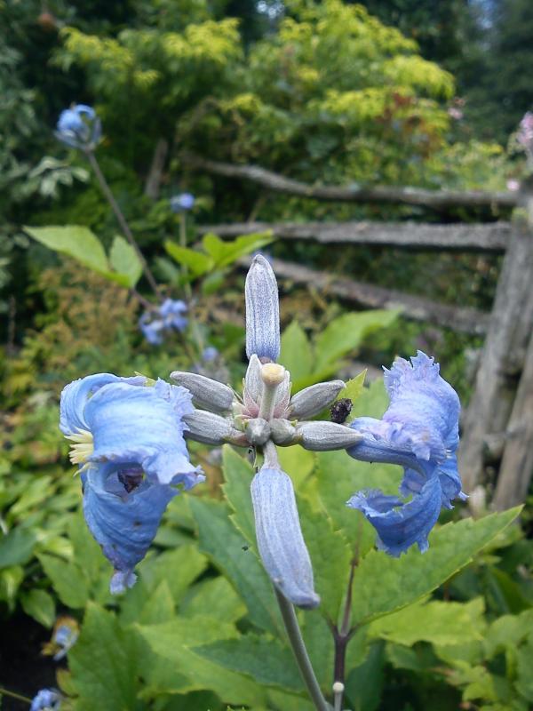 Kwiaty: małe, intensywnie niebieskie, średnica 2 cm, złożone z 4 fryzowanych, wywiniętych działek; kwitnie VII˗IX.