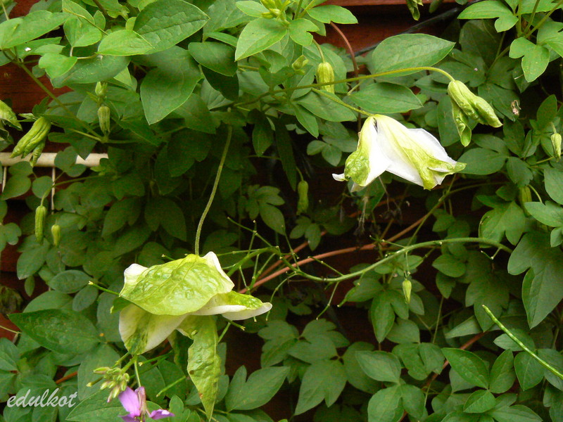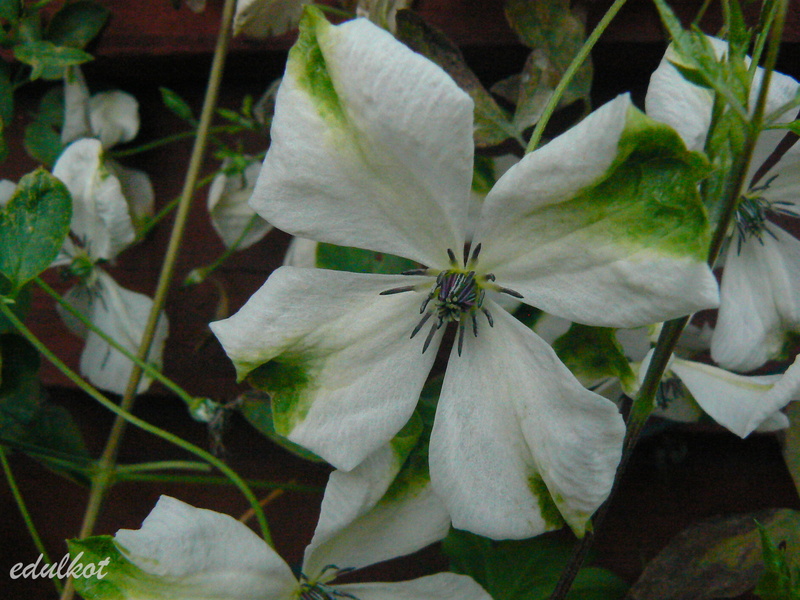 Kwiaty: średnie, ok 6 cm, białe z zielonymi, lekko zdeformowanymi wierzchołkami, kwitnie obficie VII i mniej intensywnie do jesieni