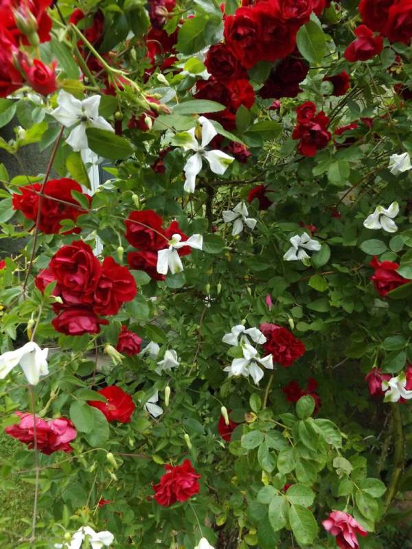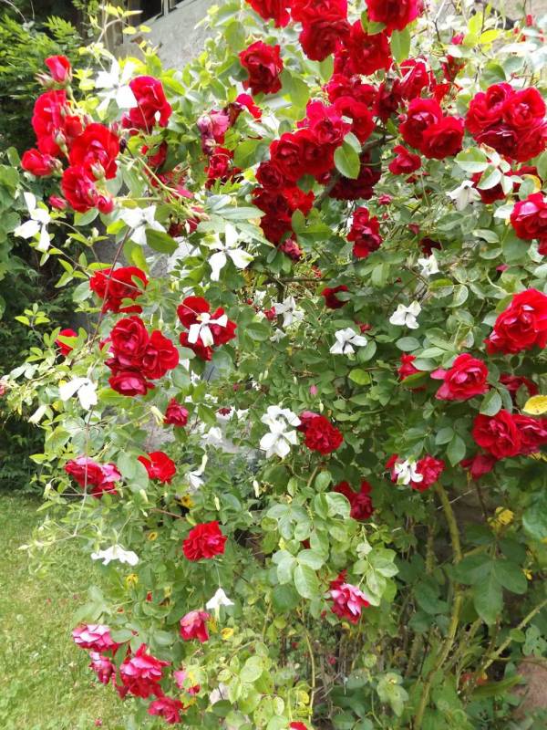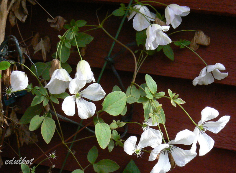 To mój najstarszy powojnik, rósł pod starym domem w bardzo zacisznym i suchym miejscu, pewnie dlatego każdego roku dopadały go grzyby i przędziorki. Wykopałam go i regenerował się w donicy, teraz muszę wyszukać mu odpowiednie stanowisko.