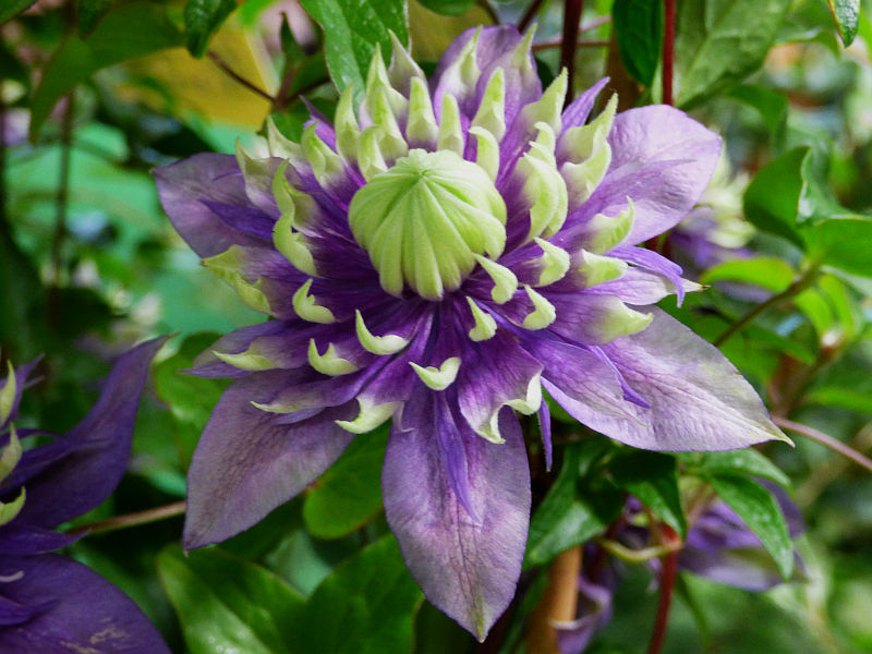 Kwiaty: pełne, fioletowoniebieskie z żółtozielonymi końcami działek... zmienne w kształcie... średnica powyżej 12 cm... kwitnie VI-IX