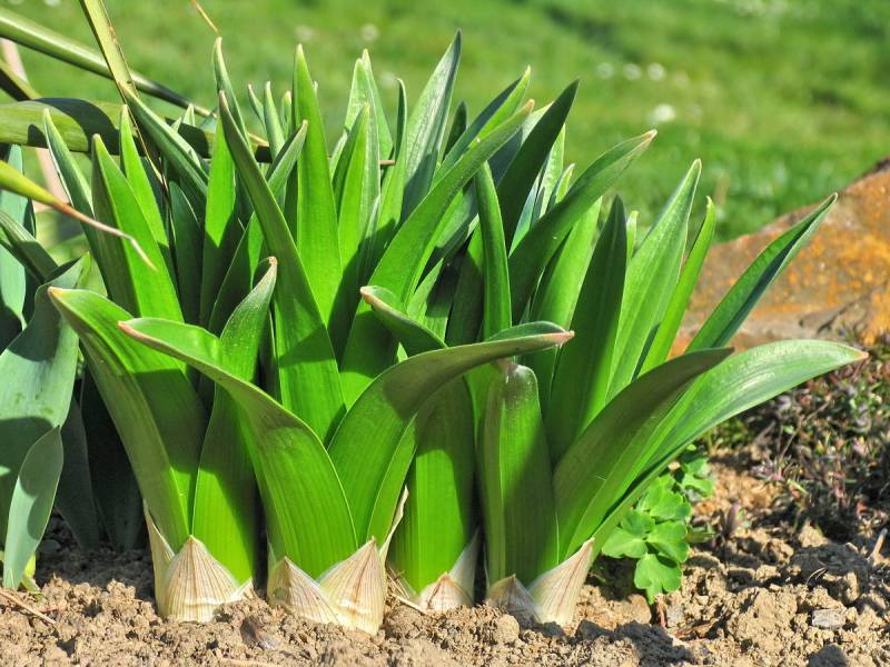 Liście zielone, podłużne, zaczynają zasychać w czasie kwitnienia rośliny.