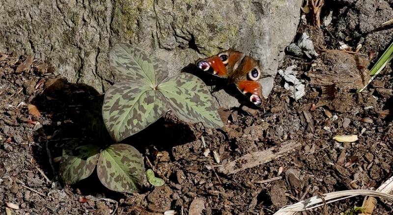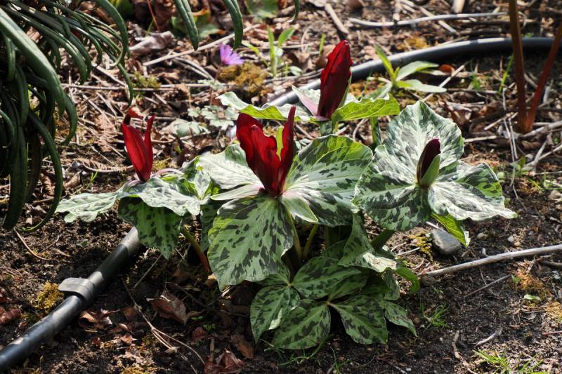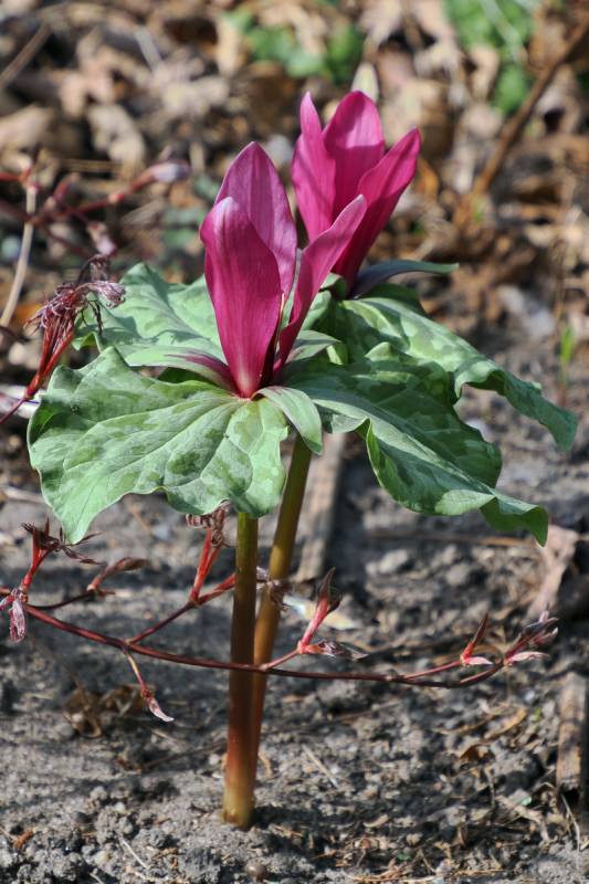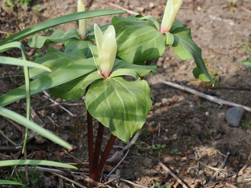 Budzi się Trillium chloropetalum. Stanowisko wiosną ma słoneczne, później półcień.