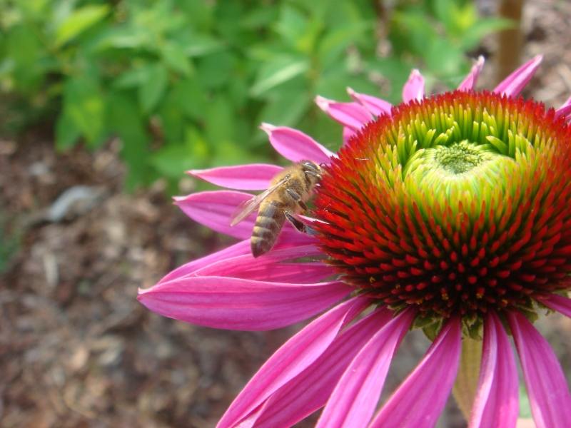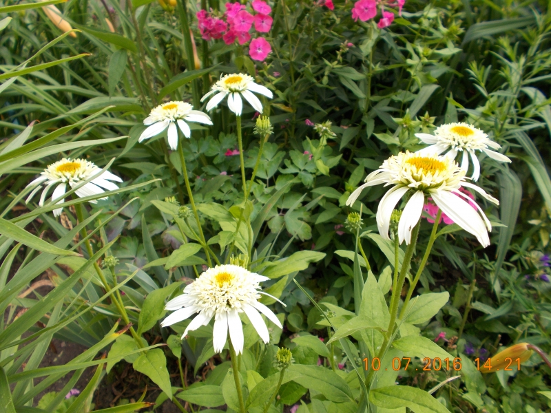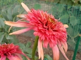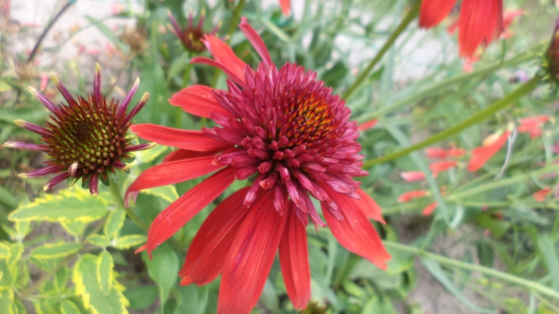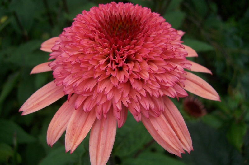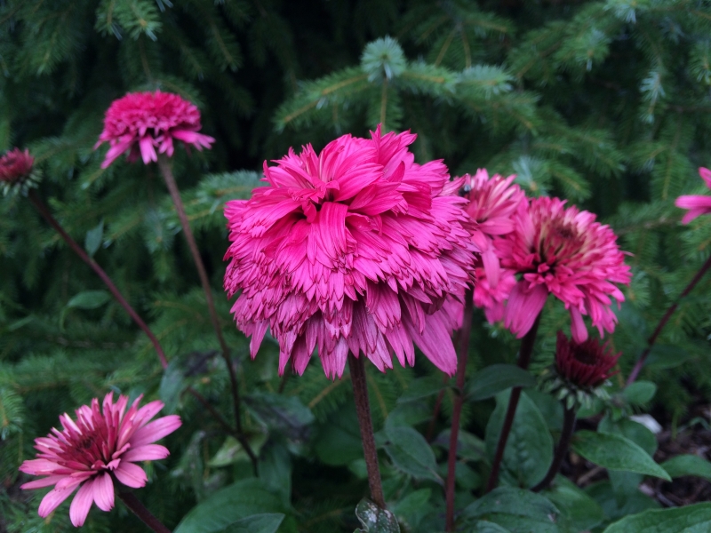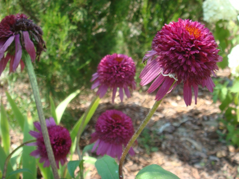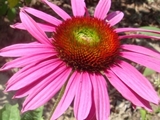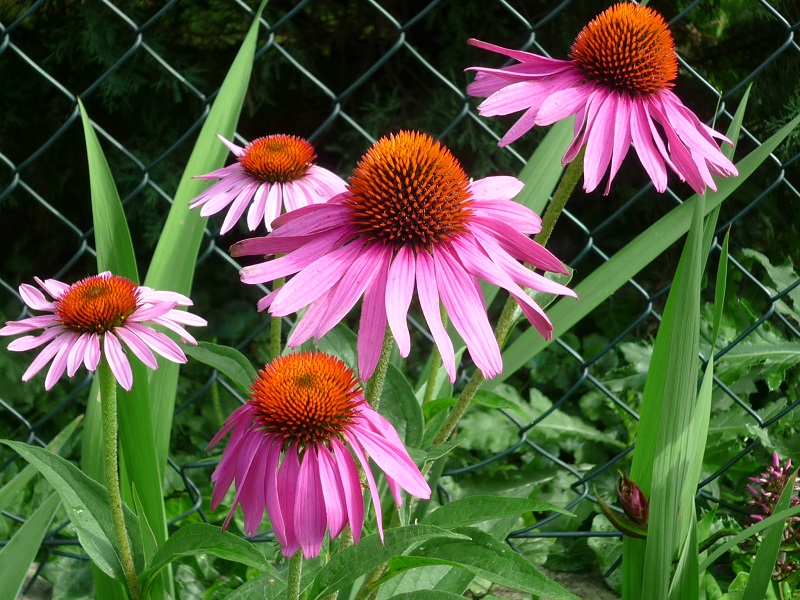 Kwiaty fioletowe lub fioletowo różowe kwiaty języczkowe przytwierdzone do wypukłego osadnika kwiatostanu.