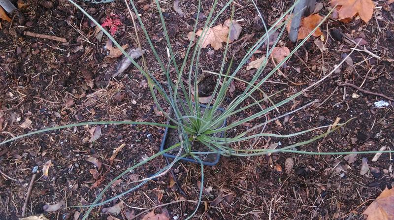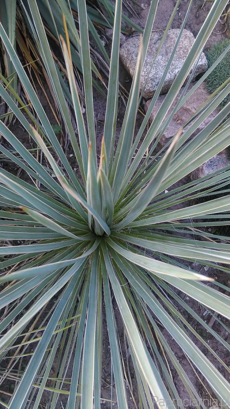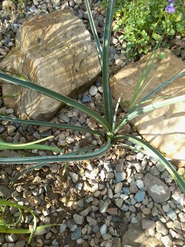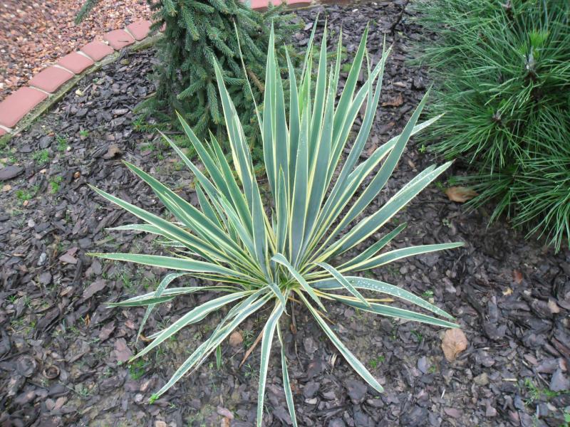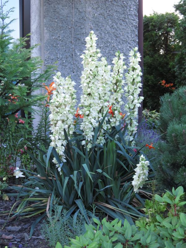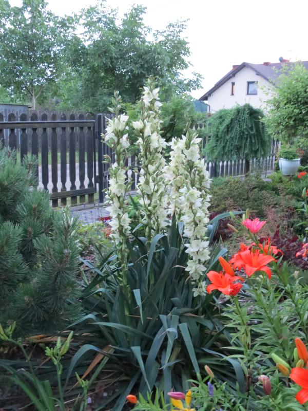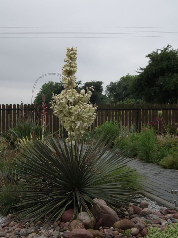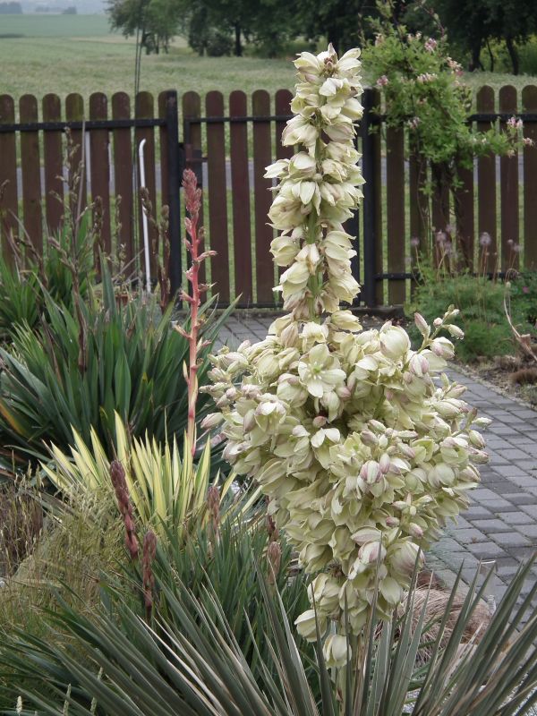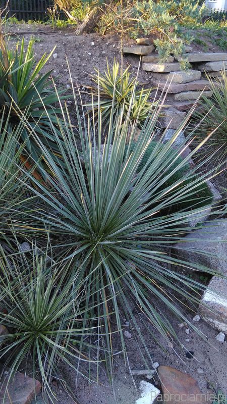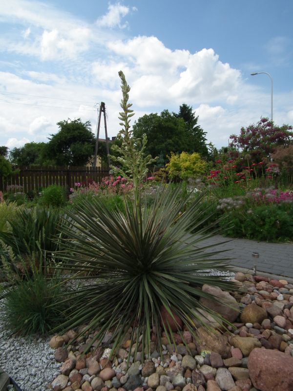 Kwiaty nisko osadzone jak u juki sinej tylko kwiatostan znacznie mniejszy i bardzo zwarty, do 50 cm