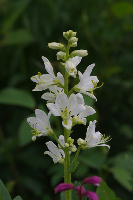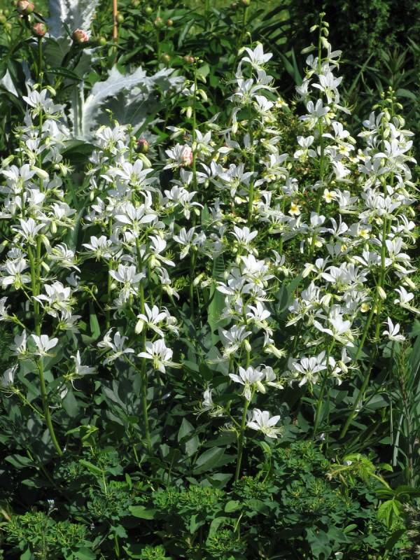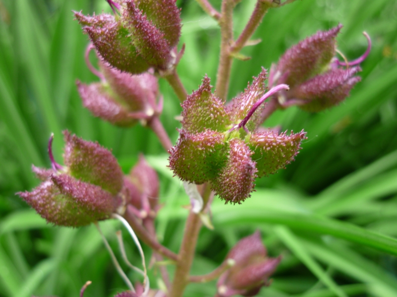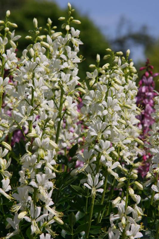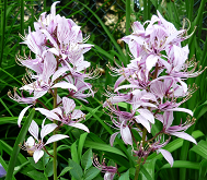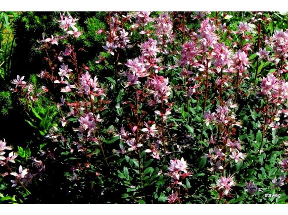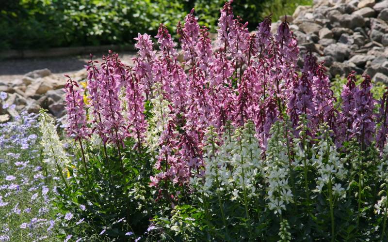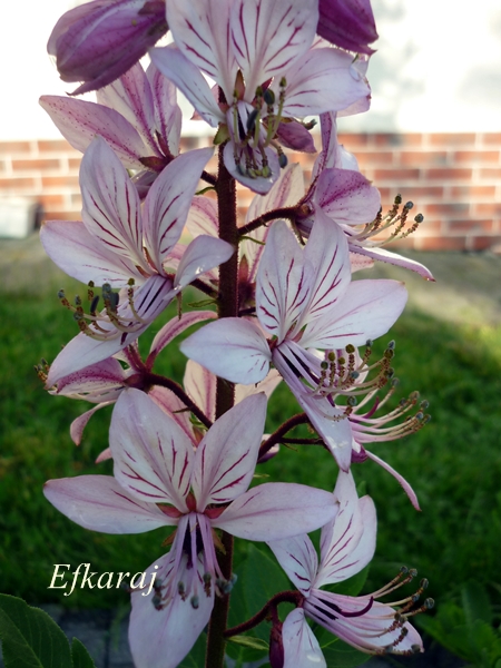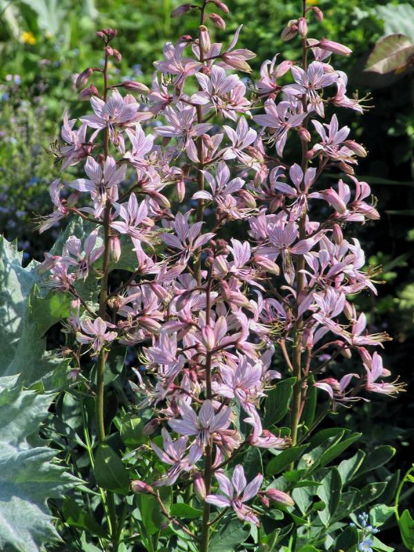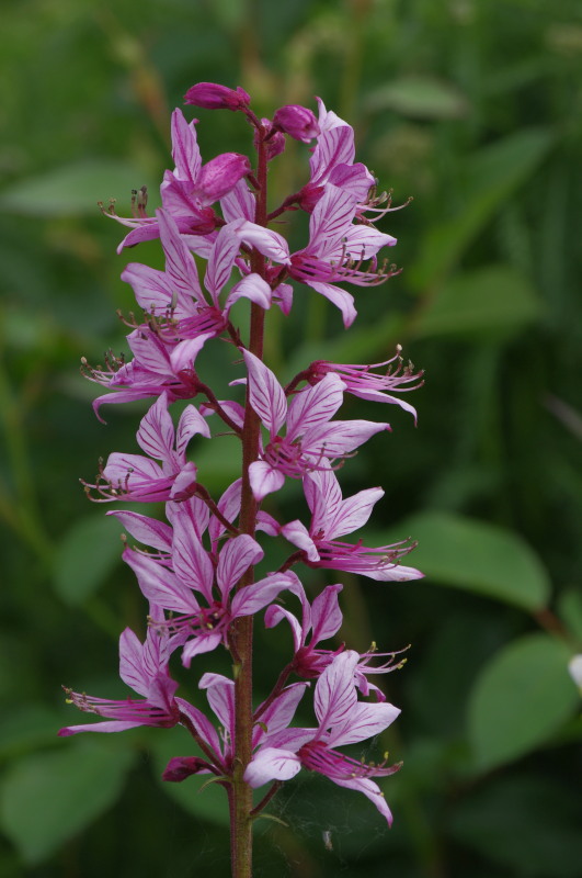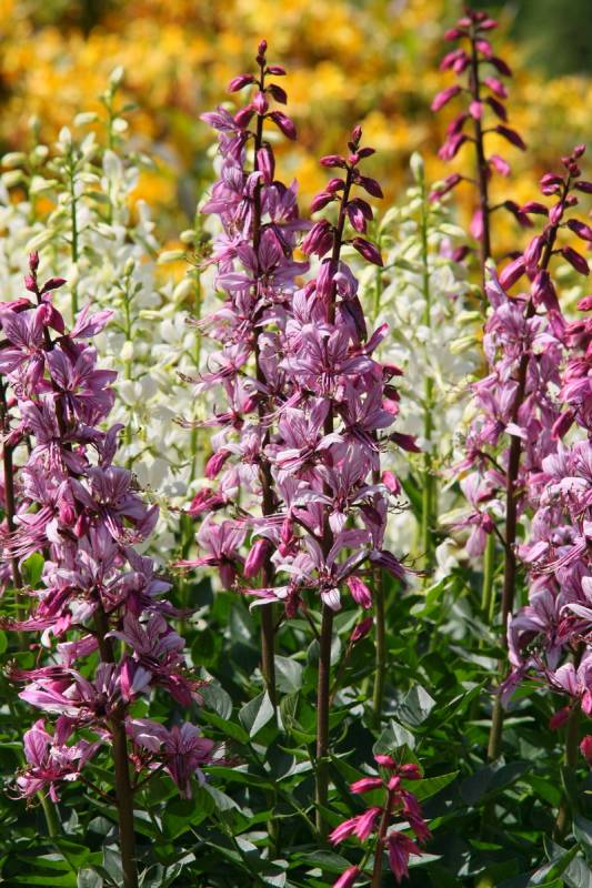 Kwiaty różowe i białe, z ciemniejszymi żyłkami, zebrane w grona na szczytach łodyg.