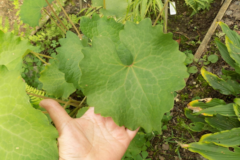 U mnie rosną niejako uwięzione na rabacie dryopterisowej, więc podróżować nie mają gdzie, ale myślę o zabraniu ich z tamtego miejsca, bo już w tym roku paproci niemal nie było widać. Ewcia podniosła kilka postów wyżej problem odpowiedniego stanowiska - jakie moje emekony były i jakie teraz są.... Dla lepszego wyczucia wielkości niektórych liści - takie zdjęcie z początkowych dni września :lol: Chyba wyjątkowo dobrze się czują w tym miejscu - gleba jest stale wilgotna i pochodzi z dna stawu. Podejrzewam, że w takiej, lub podobnej emekony rosną właśnie na naturalnych stanowiskach.