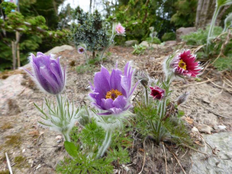 Pulsatilla albana, oraz hodowlane kultiwary. Jedną z ciekawszych jest Pulsatilla vulgaris 'Papageno' o postrzępionych płatkach.