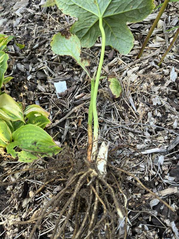 Dziś, korzystając z ochłodzenia, w końcu przesadziłam Podophyllum hemsleyi i Dysosma majoensis z tzw. tymczasowych miejscówek , na docelowe. Przy okazji mogłam ocenić, jak pod ziemią zawiązały się pąki na przyszły sezon.