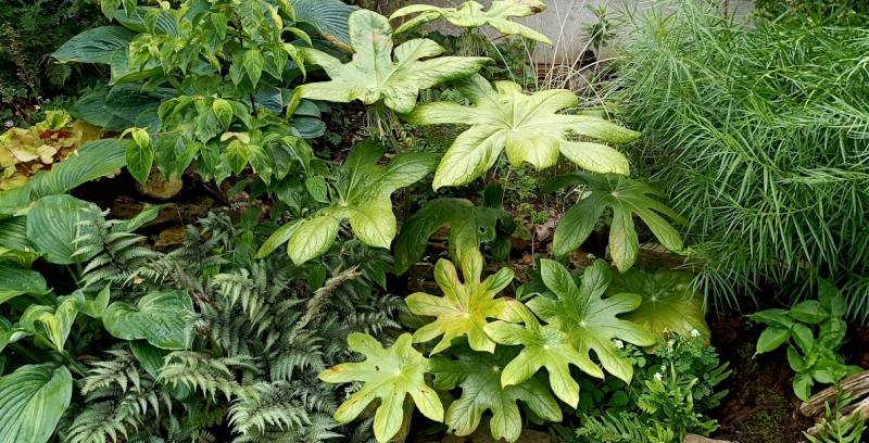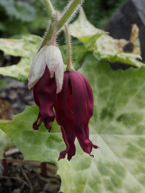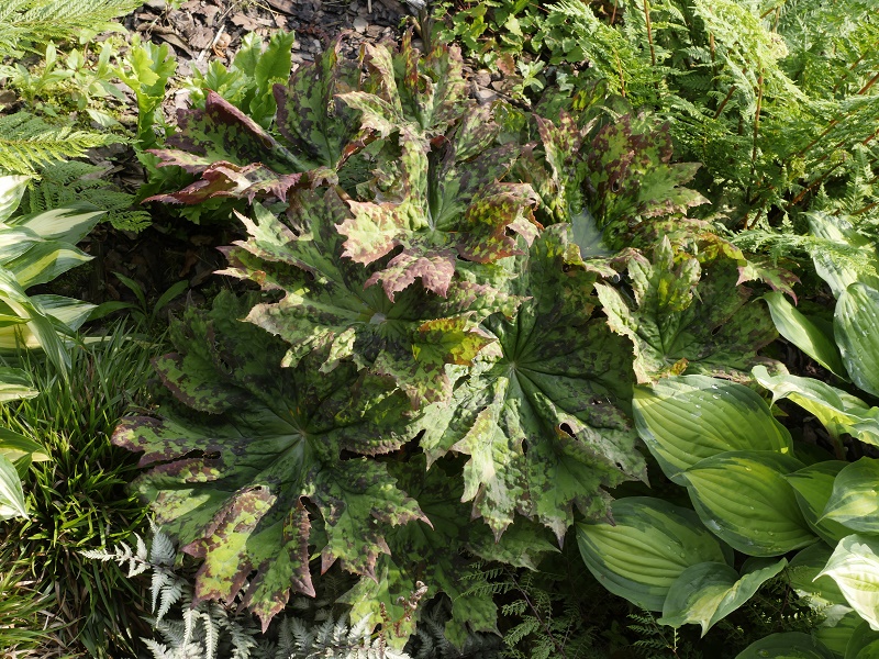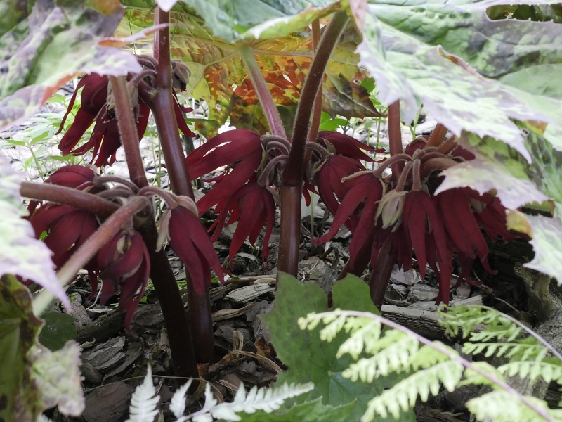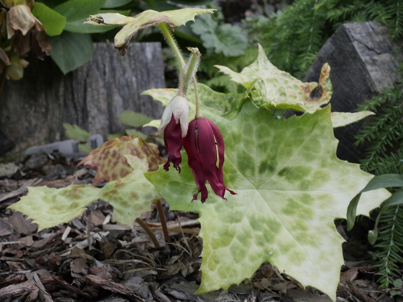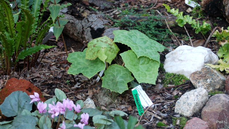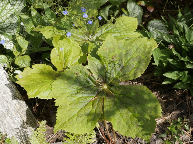 Podophyllum hemsleyi bardzo szybko startuje wiosną i co rok, pierwsze parasolki przemarzają. Dostał więc bardziej cieniste stanowisko niedaleko sosny.