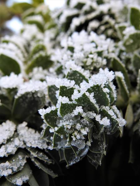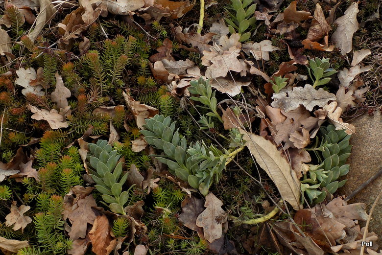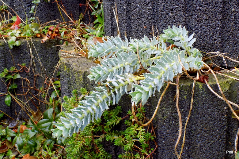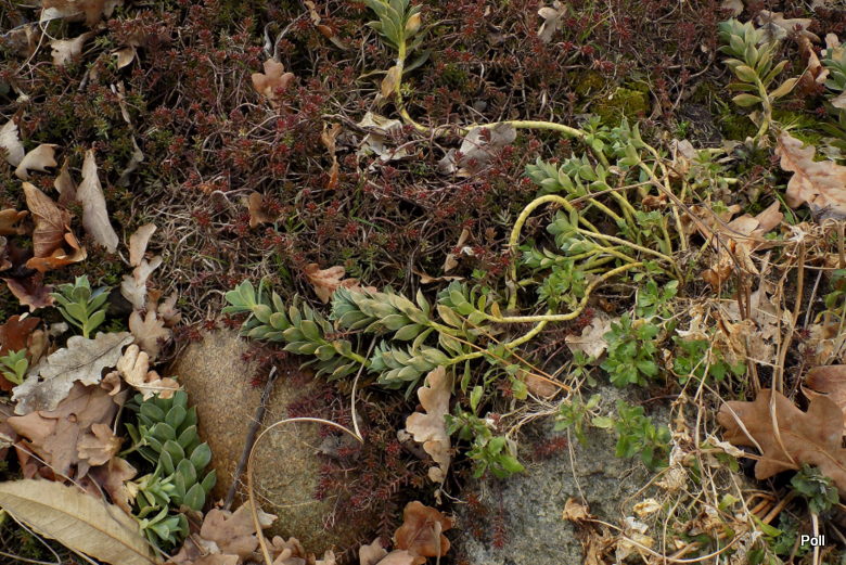 Liście: ok.1,5-2cm ,niebieskie, ostro zakończone ; spiralnie ułożone na płożących pędach długości 30 cm