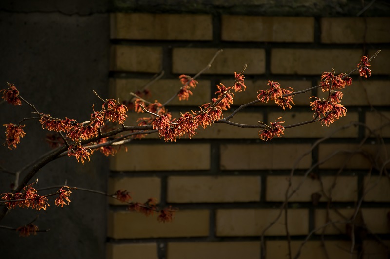 Rozłożysty, asymetryczny. Kwitnie zimą (luty), tworząc na nagich gałązkach skupiska frędzelkowatych pomarańczowo-miedzianych kwiatów. Kwiaty wytrzymują spadki temperatur do -5C. Kwitnienie obfite.