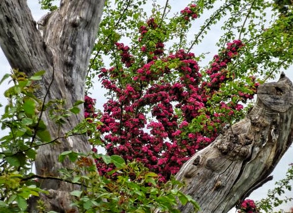 Paul's Scarlet to drzewo mojego dzieciństwa , więc musiał zagościć w moim ogrodzie :). Po ostatnim deszczu, myślałam że połamią się gałęzie pod ciężarem mokrych kwiatów.