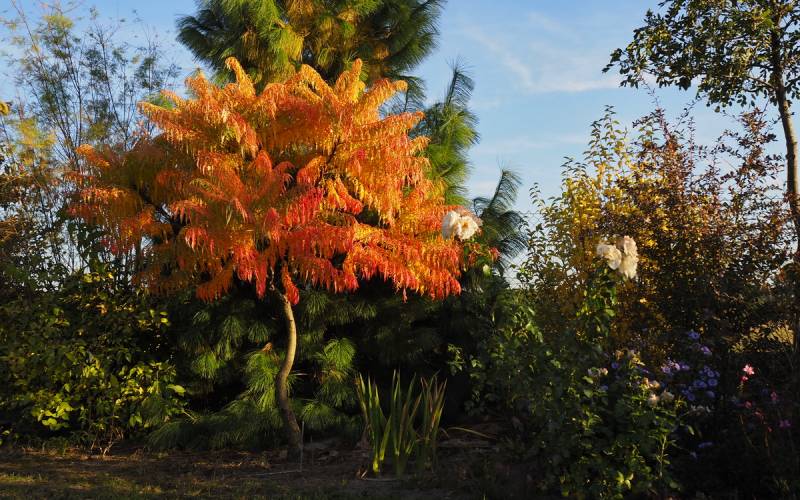 Rhus typhina, spotkać możemy w ogrodach sumaki odmianowe, różniące się kształtem i kolorem liści: