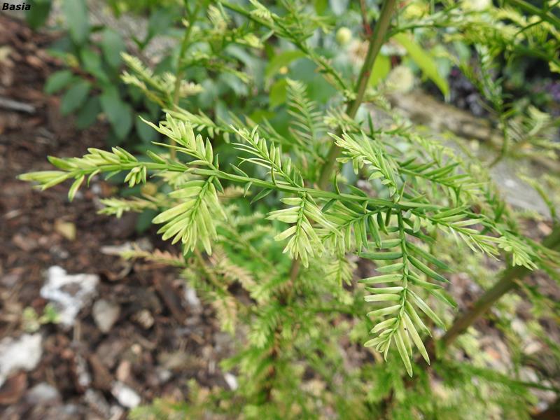 Płaskie i bardzo miękkie, niekłujące. Ustawione dwurzędowo na naprzeciwległych krótkopędach. Poszczególne szpilki o długości 1-3 cm są równowąskie. W porze listnienia przybierają żywą, trawiastozieloną barwę, później są nieco ciemniejsze. Jesienią przebarwiają się na żółto, łososiowo- lub rubinowoczerwono. Opadają wraz z pędami zielnymi w czasie przymrozków.