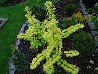 Przyjmuje stożkowy pokrój. Igły wiosną żółte, z biegiem sezonu żółto-zielone. Budowa dosyć rzadka.