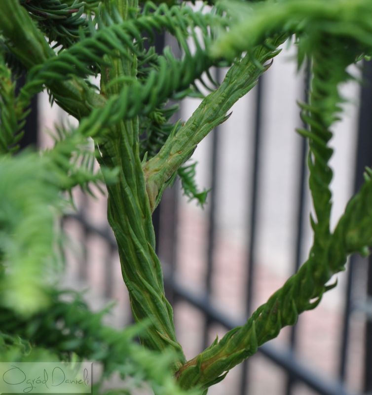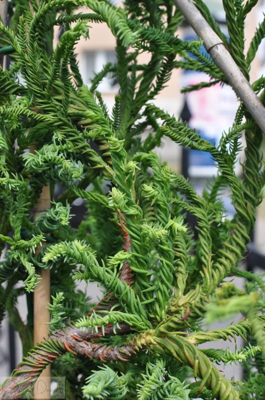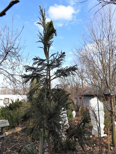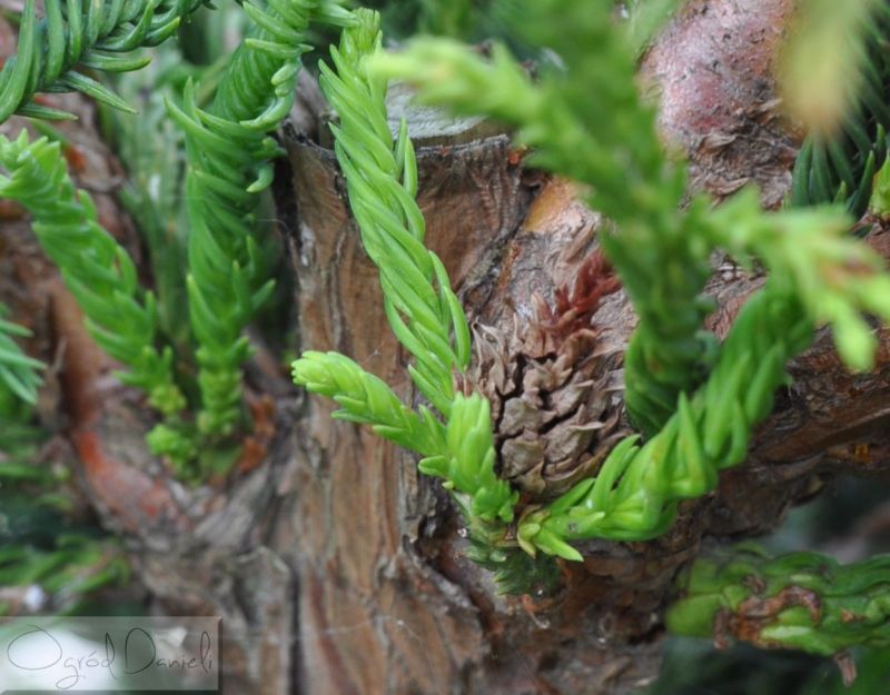 Niewielkie drzewo lub krzew pochodzący z Japonii. W zależności od odmiany mają rozmaity układ igieł. Pokazana odmiana ma igły jak korkociągowe zwoje (bliżej nasady gałązek), dalej zwoje się zagęszczają, na końcach gałązek "kręcioły". Gałązki przebiegają w różnych kierunkach, tworzy rodzaj bezładu - trudno przewidywać jak się rozrośnie. Wzbudza zainteresowanie, ciekawa roślina, mało znana w Polsce. Mrozoodporność do ok. -20 st. C.