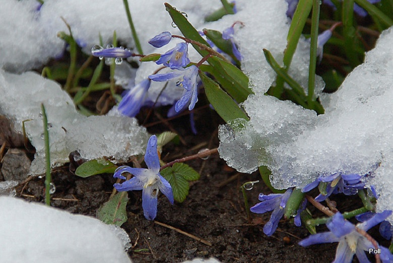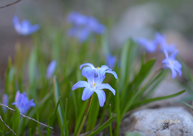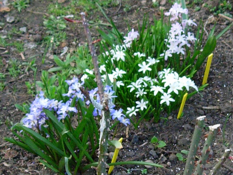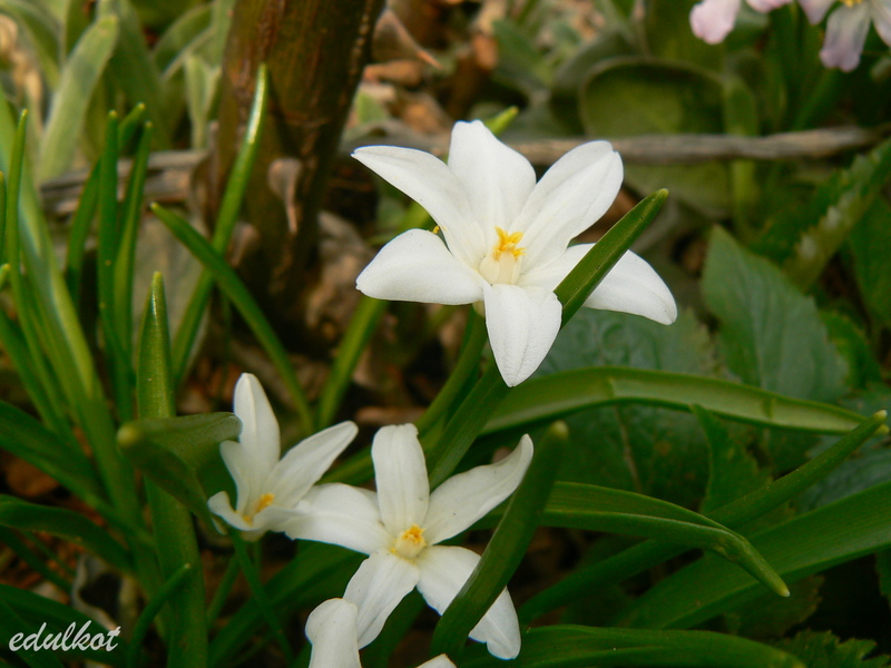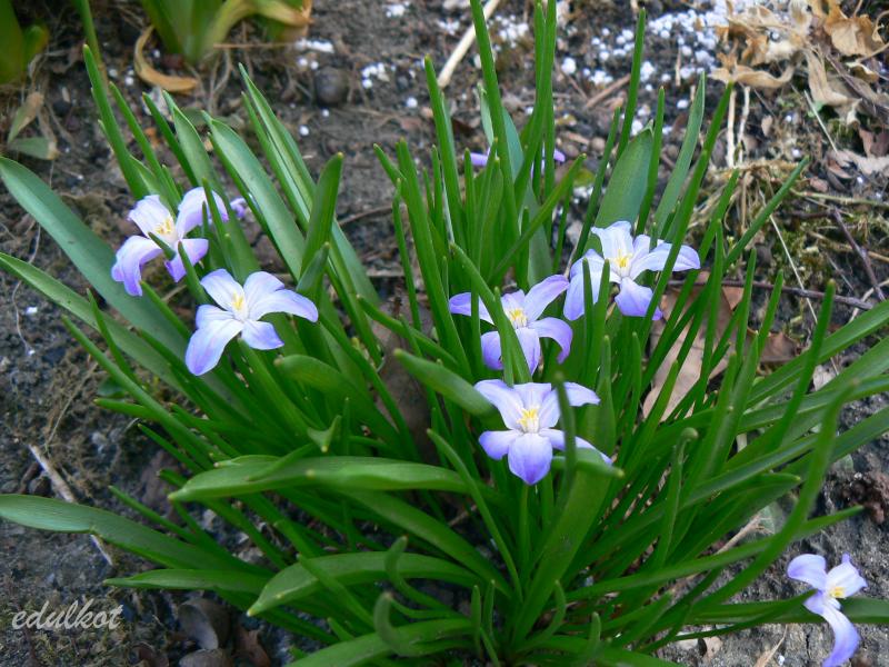 • Śnieżnik lśniący (Chionodoxa luciliae); 2–3 kwiatki na łodyżce; w środku kwiatka niewielkie białe oczko, rozmyte na brzegach (pochodzi z zachodniej Turcji, z okolic Izmiru)