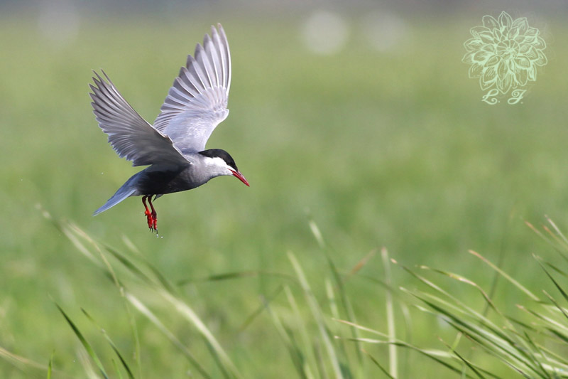 Prawdziwa ucztę obserwacyjna mieliśmy późna wiosna w tym roku. Pojechaliśmy do PN Ujście Warty i nad podmokłymi łąkami niewiele było ptaków, ale krążyły dzielnie rybitwy: białoskrzydłe i białowąse. Wyglądało to raczej na toki niż na żerowanie. Podnosiły i upuszczały źdźbła traw. Rybitwy białowąse obserwowałam również nad Zbiornikiem Siemianówka w Puszczy Białowieskiej. Bardzo podoba mi się jej upierzenie. Cieniowane skrzydła i charakterystyczny wąsik po bokach dzioba. Pożywieniem są owady, mięczaki i drobne kręgowce.