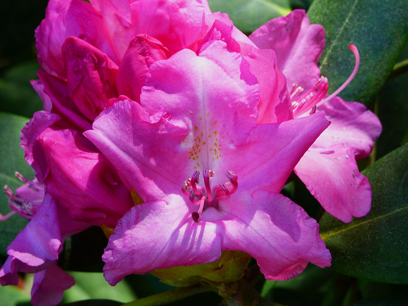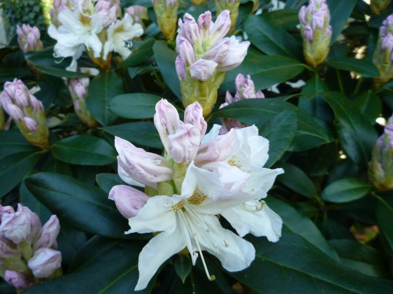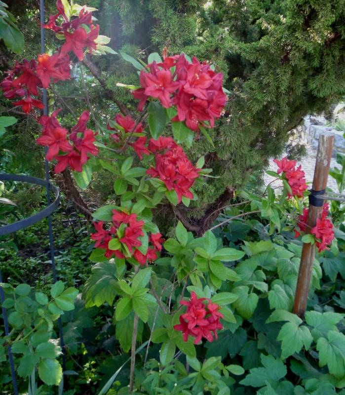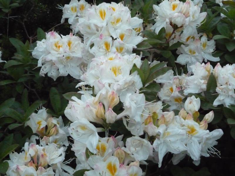 Rhododendron ludlowii albo któraś z jego odmian 'Wren' albo 'Curlew'... 'Wren dorasta po 10 latach do hen... 20 cm przy 40 cm szerokości...