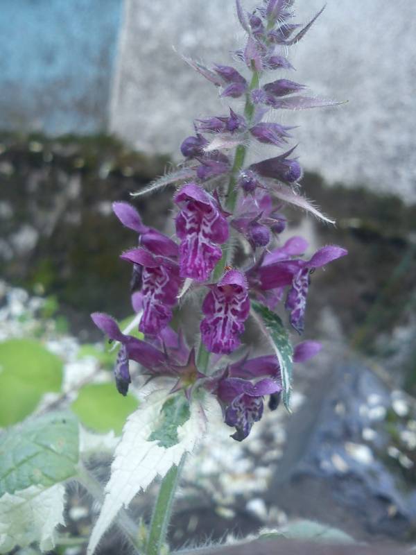 Kwiaty zebrane w okółki po 4-6 kwiatów oddalonych od siebie. Ciemnokarminowe lub czerwonofioletowe. Korona dwuwargowa; górna warga niepodzielna, dwukrotnie krótsza od dolnej. Dolna warga w białe wzorki, złożona z trzech zaokrąglonych klap. Kielich jest dzwonkowaty o ząbkach szydlastych i ogruczolony. Wewnątrz znajduje się dwudzielny słupek i 4 pręciki. Kwitnie od IV do IX.