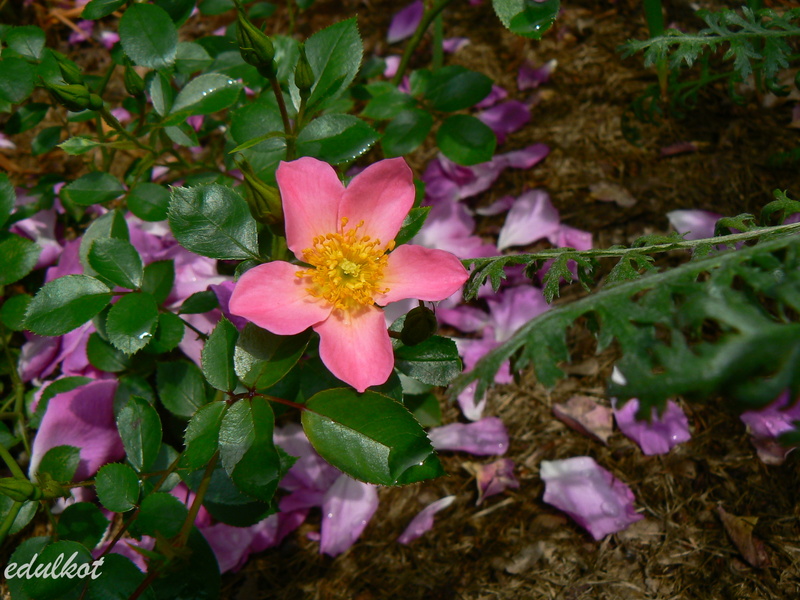 Kwiaty: małe 3-4 cm, pojedyncze (4-8 płatków), różowo-lawendowe z jaśniejszym środkiem, kwitnie cały sezon;