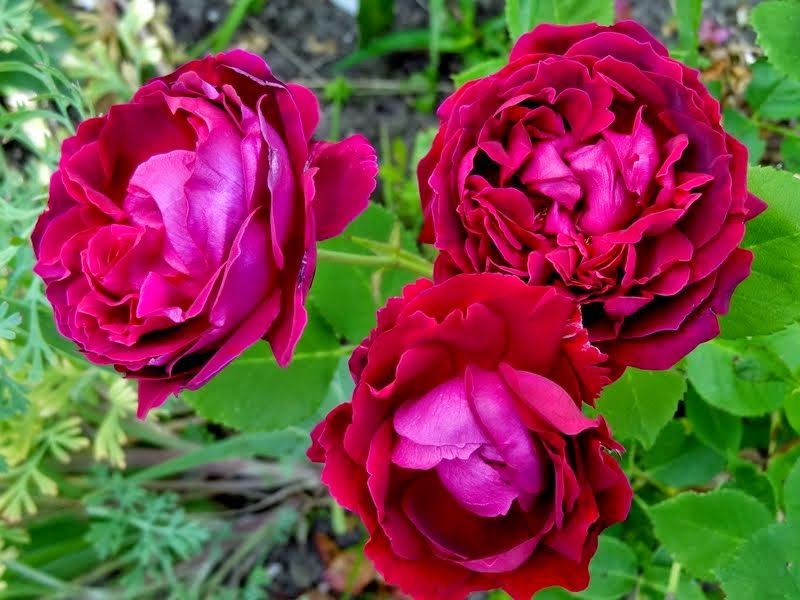 Kwiaty duże, bardzo pełne z początku czerwone potem w miarę rozwijania fioletowe. Pachnące. Odporne na deszcz.