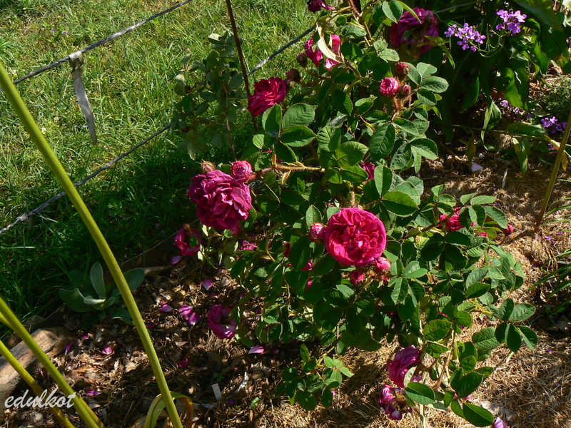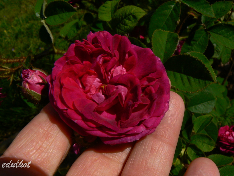 Kwiaty karmazynowe, purpurowe o rozetowej budowie, duże, podwójne, pączki jak i pędy mocno omszone