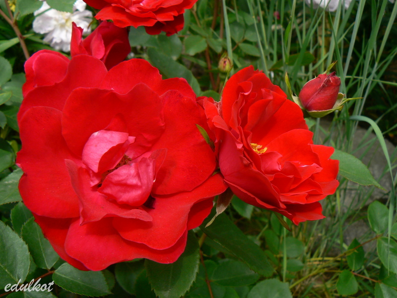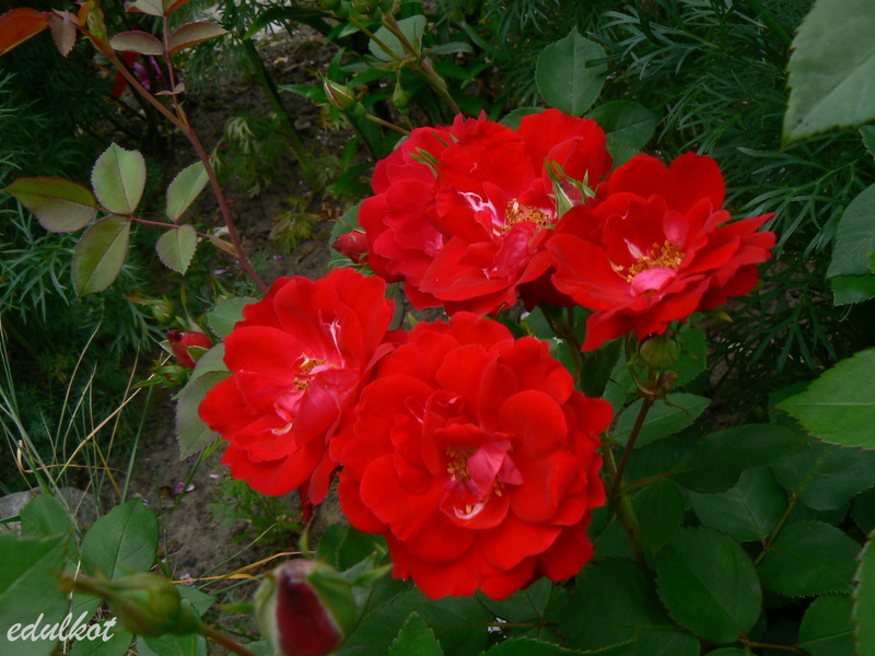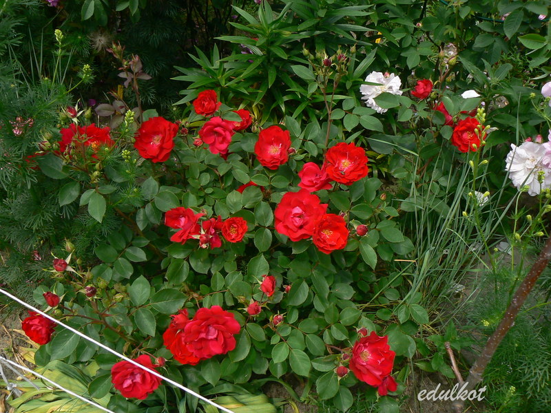 Kwiaty: szkarłatne, średnie ok. 6-7 cm, płaskie, podwójne (ok. 30 płatków), żółte pręciki, okazjonalnie powtarza.