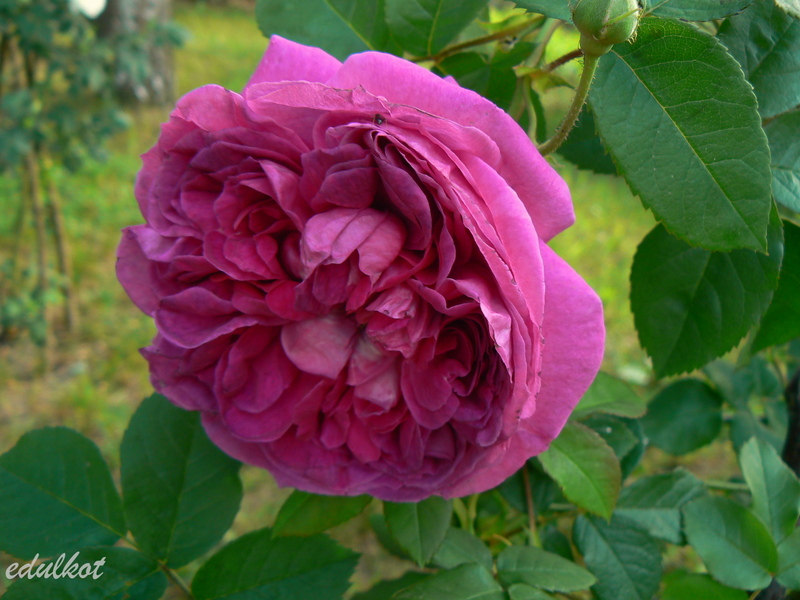 Kwiaty: purpurowo-czerwone pełne (41+ płatków), o rozetowej budowie, kwitnie tylko raz,