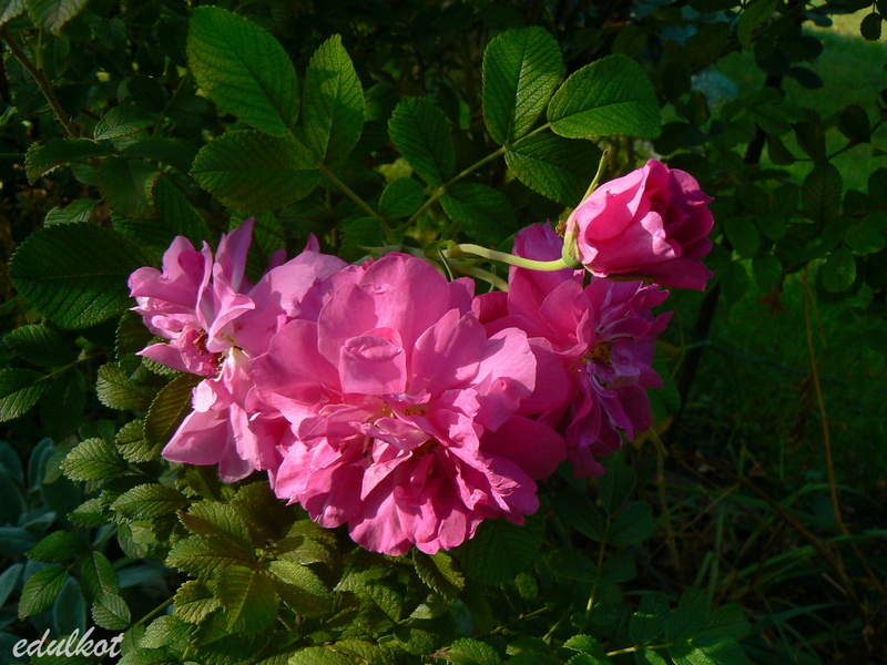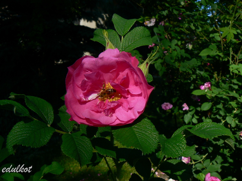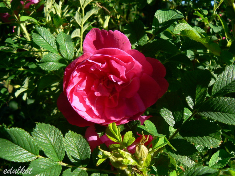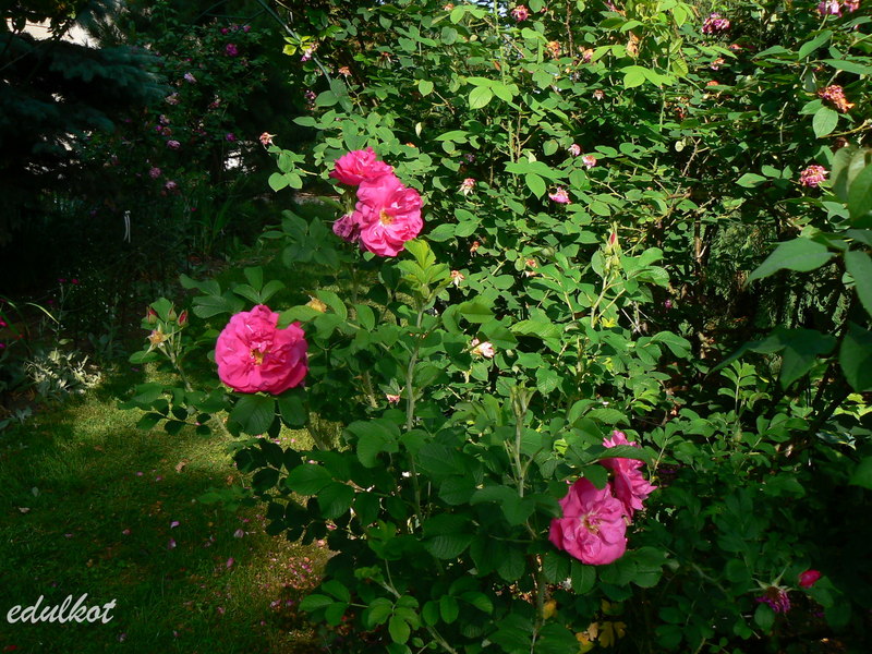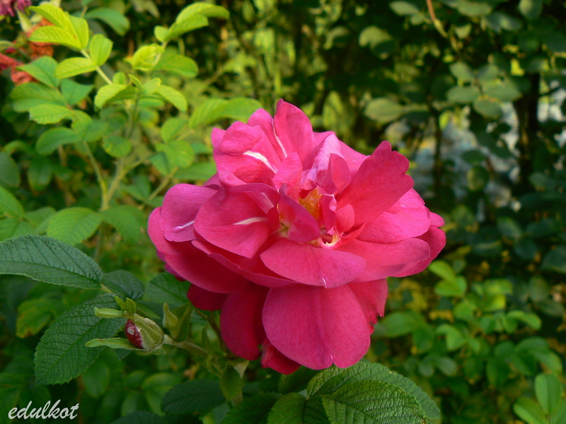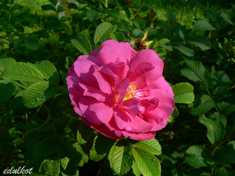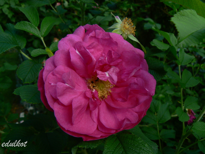 Kwiaty: ciemnoróżowe, średnie średnica ok. 7 cm, półpełne (17-25 płatków), rozkwitając pokazują żółte pręciki, obficie kwitnienie wiosną i latem, ale ciągle pojawiają się na niej jakieś bukieciki.