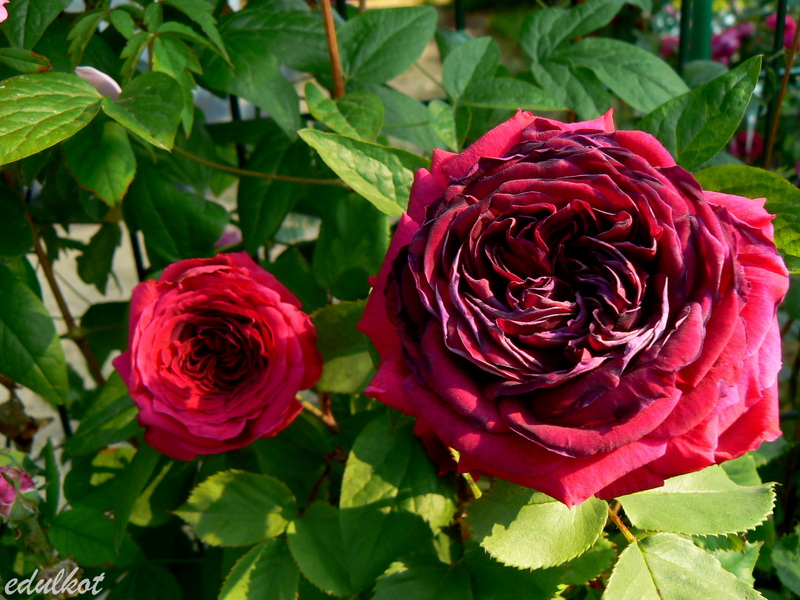 Kwiaty: ciemnoczerwone do purpurowych, ćwierć-rozetowe, duże średnicy 10 cm, pełne (ok. 50 płatkó), słabo powtarza,