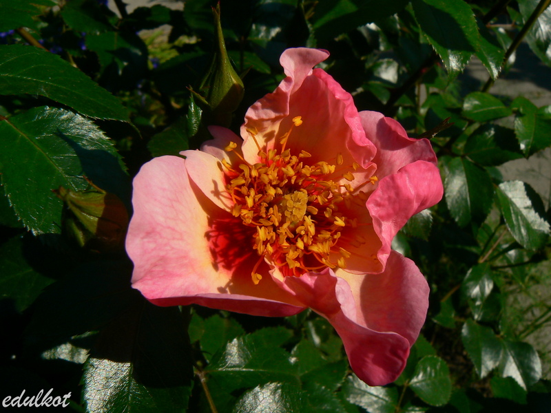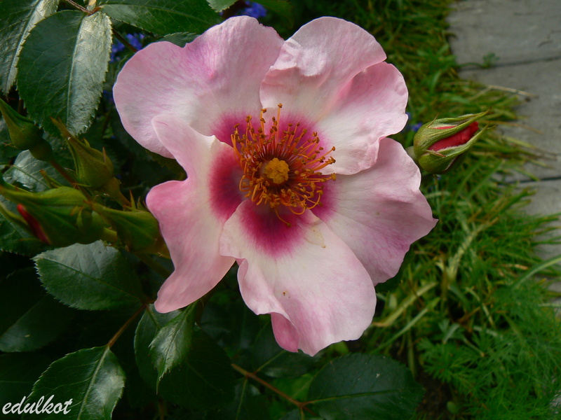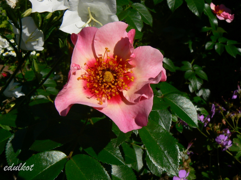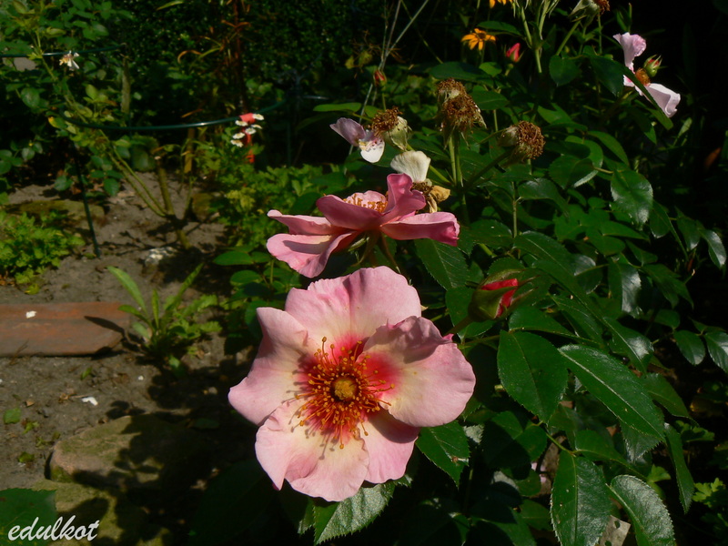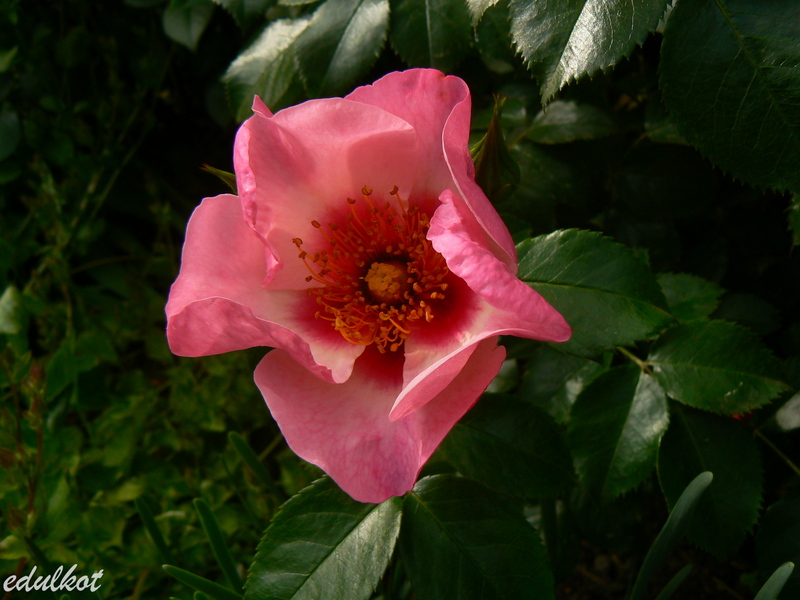 Kwiaty: pojedyncze (4-8 płatków), średnie ok. 7 cm, różowe z ciemniejszym oczkiem charakterystycznym dla róż perskich, rozkwitając pokazuje bardzo ładny zestaw pręcików, kwitnie przez cały sezon,