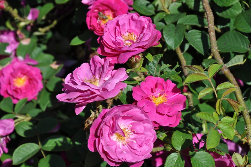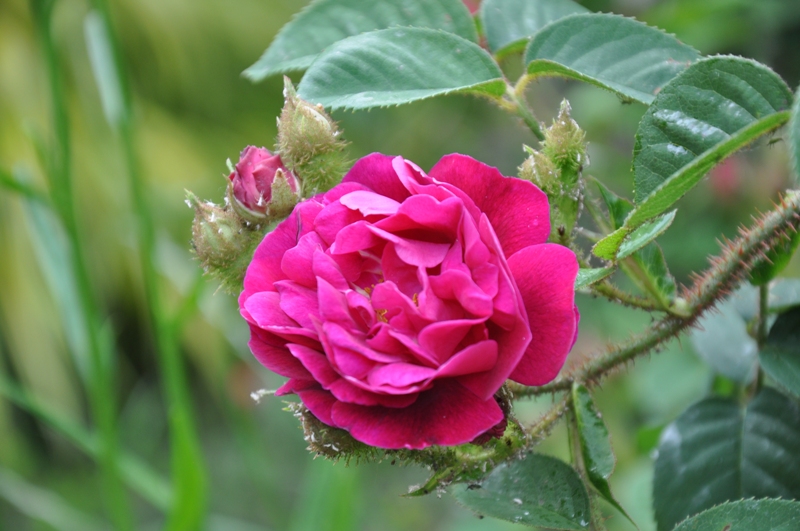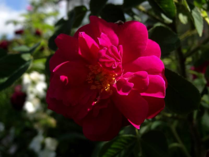 Kwiaty: średnie ok. 6-7,5 cm, półpełne, ciemno różowe poprzez liliowe do czerwonych, w rozkwicie pokazuje żółte pręciki, pąki okryte zielonym mchem, kwitnie raz choć podobno czasami powtarza, zawiązuje owoce,
