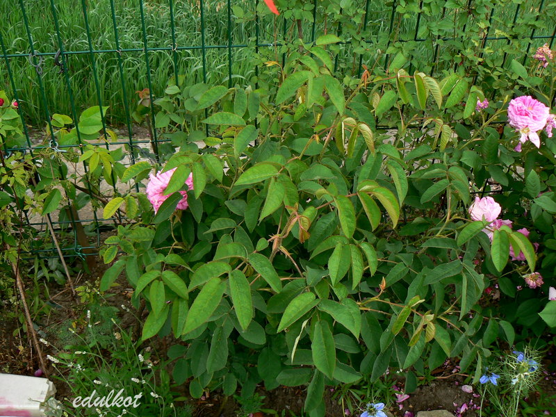 Róża Centifolia, Damascena, Pochodzenie: nieznane, jest podawane że została w Malamaison Cesarzowej Józefiny, ale również jakoby pochodziła z Holandii, Kwiaty: różowo fiołkowe, duże ok. 6-10 cm, pełne, ćwierćrozetowe, kwitnie raz, Zapach: mocny, Wielkość: wysokość 0,9-1,2 m, szerokość 0,9 m, Mrozoodporność: strefa 4b,