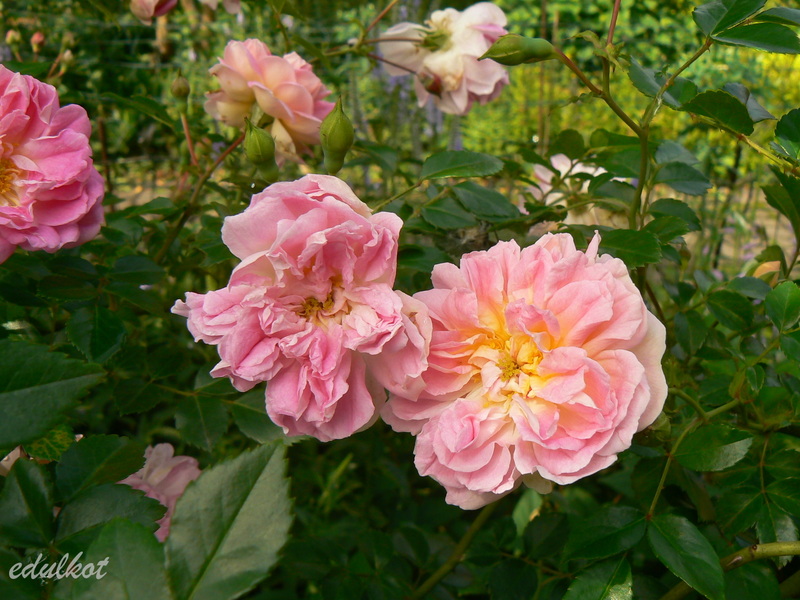 Kwiaty: małe, półpełne, miseczkowate do płaskich, różowe do jasno-różowych z żółtawą poświatą w środeczku, kwitnie latem, czasami powtarza;