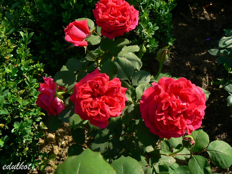 Kwiaty: duże 9 cm, pełne (26-40 płatków), rozetowe, czerwone, powtarza;