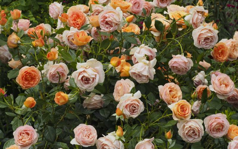 Kwiaty: miedziano-brzoskwiniowe, wpadające w pomarańczowy, a nawet różowy; mocno wypełnione ( Ø: 8 cm ),