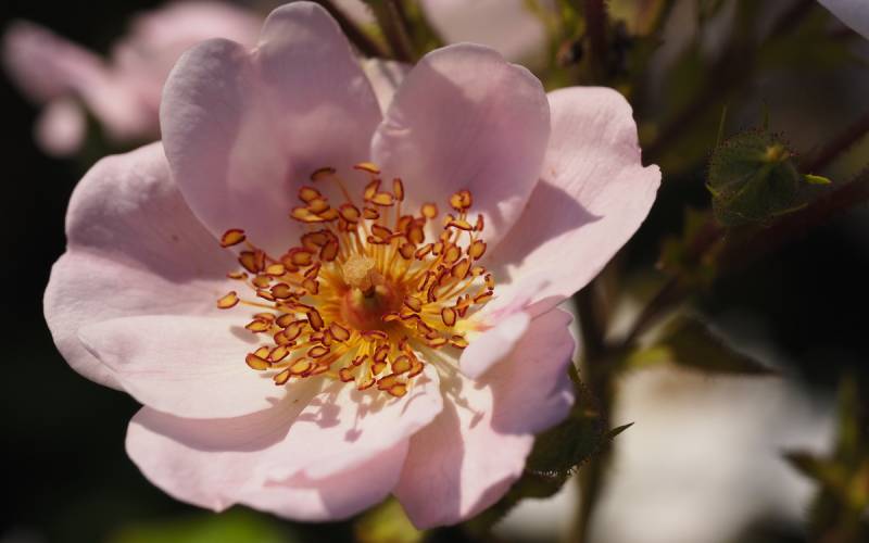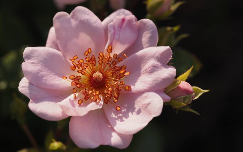 Kwiaty: jasnoróżowo-liliowe, pojedyncze ze ślicznym wachlarzem pomarańczowo-czerwonych pręcików ( Ø: 4-6 cm ); kwitnie niestrudzenie przez cały sezon, sama czyści się z niechcianych płatków
