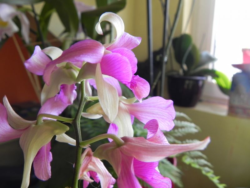 Białe Dendrobium nobile zakupione na prezent w jednym z większych w okolicy centrów ogrodniczych, ale po zmianie planów prezentowych zostało u nas. Po kwitnieniu zaczęło dziwnie podgniwać. Okazało się że pod niewielką warstwą mieszanki do storczyków była zwykła ziemia. Roślinkę pozbawiłem ziemi i przesadziłem do mieszanki dla storczyków dodając w środkowej warstwie centymetrową warstwę perlitu. Pędy przestały podgniwać i po 2-3 miesiącach pojawiło się coś takiego na jedynym pędzie który przetrwał na samej górze.