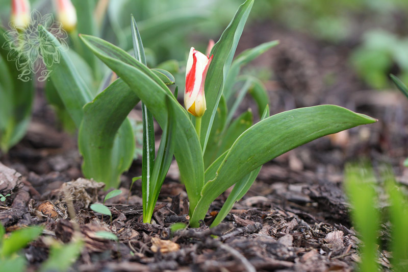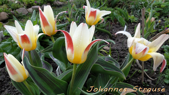 Tulipan 'Johann Strauss' (razem z czerwonokwiatową odmianą 'Shakespeare') zaczął rozwijanie kwiatów bardzo wcześnie, bo już 19 marca. To chyba jednak pierwsze i ostatnie zdjęcia, bo po przedwczorajszym nocnym mrozie położyły się na ziemi i tak do dziś leżą.