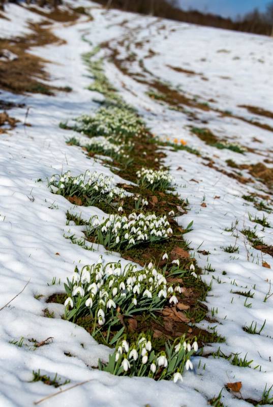 Gdzie dokładnie tajenie śniegu wpisuje się w klasyczne zasady kompozycji? Oto jak pięknie „wpasowuje się” ten czynnik w 5 podstawowych zasad kompozycji ogrodowej (te same, które znasz z książek o projektowaniu ogrodów): 1.Analiza miejsca / site-specific design (podstawowa zasada nr 1!) Każdy dobry projekt zaczyna się od mapy mikroklimatu: światło, wiatr, wilgotność, temperatura gleby. Tajenie śniegu to po prostu kolejny mikroklimatyczny parametr – taki sam jak „ściana południowa jest o 4–5°C cieplejsza” czy „dno doliny jest wilgotniejsze”. Wpisz go na planie jako „strefy fenologiczne” (strefy różnic w czasie kwitnienia). To nie jest „trikiem”, tylko precyzyjną analizą terenu. 2. Sekwencja i ciągłość kwitnienia (succession planting) Klasyczna zasada: ogród ma kwitnąć od marca do października. Dzięki różnicy w tajeniu śniegu zamieniasz statyczną rabatę w dynamiczną falę – wiosna dosłownie „wędruje” w dół stoku. To jest najwyższa forma sukcesji sezonowej! Efekt: zamiast 2–3 tygodni kwitnienia masz 6–8 tygodni ciągłego spektaklu. 3 Rytm i ruch (rhythm & movement) Na stoku masz naturalną „ścieżkę kompozycyjną” (ścieżka w górę).Sadząc najwcześniejsze rośliny na górze, a późniejsze na dole – tworzysz rytm czasowy. Idąc ścieżką wiosną, dosłownie „podążasz za wiosną”. To jest ruch w kompozycji nie tylko przestrzenny, ale też temporalny (czasowy) – coś, co w ogrodach japońskich czy angielskich naturalistycznych jest bardzo cenione. 4.Kontrast i harmoniia Kontrast: szybka wiosna na górce vs. powolna na dole → dramaturgia. Harmonia: wszystko pozostaje w naturalistycznym stylu – nie sadzisz nic egzotycznego, tylko wykorzystujesz to, co daje sama natura. 5. Warstwowanie i powtarzalność Te same gatunki (krokusy, szafirki, narcyzy) powtarzasz w różnych odmianach i terminach kwitnienia – dokładnie tak, jak w klasycznym warstwowaniu bylin (wysokie z tyłu, niskie z przodu).Tylko że tu warstwujesz w czasie zamiast tylko w przestrzeni. Przygotowałam i opracowałam zestawienie, które jest bardzo pomocne przy planowaniu stoku i może też mieć zastosowanie w ogrodach na pochyłościach. Dotyczy ono mojego ogrodu i dzielę się tym opracowaniem z Wami.. To nie jest „nowy wynalazek” – to po prostu fenologiczna kompozycja (z angielskiego phenological planting), stosowana od lat w ogrodach górskich (np. w Alpach, w ogrodach Beth Chatto w Anglii czy w polskich ogrodach na stokach Beskidów). Tylko mało kto o tym głośno pisze, bo wymaga obserwacji przez minimum 2–3 zimy. Podsumowując: Nie łamiesz żadnych zasad kompozycji – wznosisz je na wyższy poziom. Wykorzystujesz to, co daje Ci teren, zamiast walczyć z nim. Oto projekt fali wiosennego kwitnienia („kroczenia wiosny”) na moim terenie – wykorzystujący naturalne różnice w topnieniu śniegu i nagrzewaniu gleby. Dzięki temu efekt ciągłego kwitnienia może trwać od końca lutego/początku marca aż do końca kwietnia / początku maja (w zależności od pogody w danym roku).Podzieliłam rośliny na 4 fale czasowe i przypisałem je do 3 stref stoku: Górka piaszczysta południowo-zachodnia → najwcześniejsza, najszybsza wiosna Środkowa część stoku / przejściowa → średnia fala Wschodnia ściana → najpóźniejsza, przesunięta o 2–4 tygodnie Fala 1 – bardzo wczesna (koniec lutego – marzec, czasem przez resztki śniegu) Miejsce: głównie górka południowo-zachodnia (najszybsze nagrzewanie i topnienie śniegu) Przebiśnieg śnieżyczka (Galanthus nivalis) Rannik zimowy (Eranthis hyemalis) Krokus złocisty (Crocus chrysanthus) – odmiany: Cream Beauty, Blue Pearl, Goldilocks, Spring Snow Krokus tommasinianus – odmiany: Lilac Beauty, Ruby Giant, Whitewell Purple Efekt: pierwsze białe, żółte i jasnoliliowe plamy, często na tle resztek śniegu lub mokrej ziemi Fala 2 – wczesna (marzec – początek kwietnia) Miejsce: górka + środkowa część stoku Krokus wiosenny (Crocus vernus) – odmiany: Jeanne d’Arc (biały), Flower Record (fiolet), Pickwick (paski) Miniaturowe narcyzy: Tête-à-Tête, Jetfire, February Gold Cebulica syberyjska (Scilla siberica) Spring Beauty Wschodnia ściana dopiero zaczyna: wczesne tommasinianusy + przebiśniegi + ranniki Efekt: górka już mocno kolorowa (żółty + błękit + biały + fiolet), niżej dopiero pierwsze plamy Fala 3 – średnia (kwiecień – połowa kwietnia) Miejsce: środkowa część stoku + początek wschodniej ściany Szafirki (Muscari armeniacum) – odmiany: Ocean Magic, Grape Ice Puszkinia scilloides (Puschkinia libanotica) Narcyzy wyższe botaniczne: Thalia (biały), Hawera (żółty) Wschodnia ściana: krokusy wiosenne późniejsze odmiany + miniaturowe narcyzy + cebulice Efekt: przejście od drobnych dywaników do większych, puszystych chmur błękitu, bieli i żółci Fala 4 – późna wiosenna (połowa kwietnia – maj) Miejsce: głównie wschodnia ściana + dolna część stoku Szafirki armeńskie późne odmiany Narcyzy średniowysokie: Ice Follies, Carlton Botaniczne tulipany: Tulipa kaufmanniana, greigii (np. Showwinner, Persian Pearl, Heart’s Delight) Zawilce greckie (Anemone blanda) – odmiany: White Splendour, Blue Shades, Charmer, Pink Star Efekt: wschodnia ściana dogania i kwitnie najmocniej, gdy na górce już zielono i zaczynają się trawy + wczesne byliny Jak to posadzić, żeby „wiosna kroczyła” ze ścieżką w dół stoku? Najwcześniejsza fala (Fala 1) – na samej górze i wzdłuż górnej części ścieżki (widoczne od razu po wejściu na stok). Fala 2 i 3 – w środkowej części stoku, wzdłuż trasy spacerowej. Fala 4 – na dole, przy wschodniej ścianie (ostatni etap „wędrówki” wiosny). Sadź w dużych, nieregularnych grupach (po 30–100+ szt. w plamach), a nie pojedynczo – wtedy efekt jest piorunujący. Po kwitnieniu nie ścinaj liści przez minimum 6–8 tygodni – to klucz do 