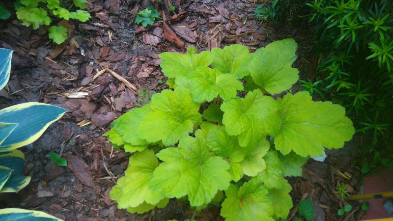 Rodzaj: Żurawka (Heuchera) Odmiana: Delta Dawn Wymiary: tworzy kępy o średnicy 30 cm i wysokości 20 cm/35 cm z kwiatostanem. Kolorystyka: czerwone liście z zielono- żółtą obwódką . Kwiaty: białe. Kwitnienie: od czerwca do sieprnia. Warunki: stanowisko pół-cieniste.