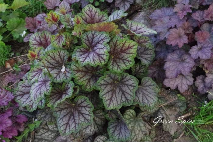 Rodzaj: Żurawka (Heuchera) Odmiana: Green Spice Wymiary : tworzy kępy o szerokości 40 cm i wysokości 25 cm . Kolorystyka: białe kwiaty. Liście metaliczne z mocno zaakcentowanym,szczególnie wiosna, zielonym marginesem z mocno kontrastowym, czerwonym unerwieniem . Warunki: stanowisko cieniste/pół-cieniste/na słonecznym wymaga wilgotniejszej gleby. Kwitnienie:maj/czerwiec.